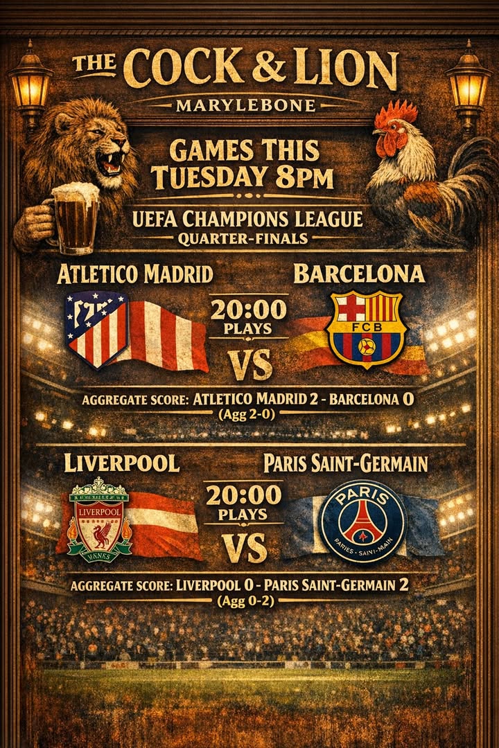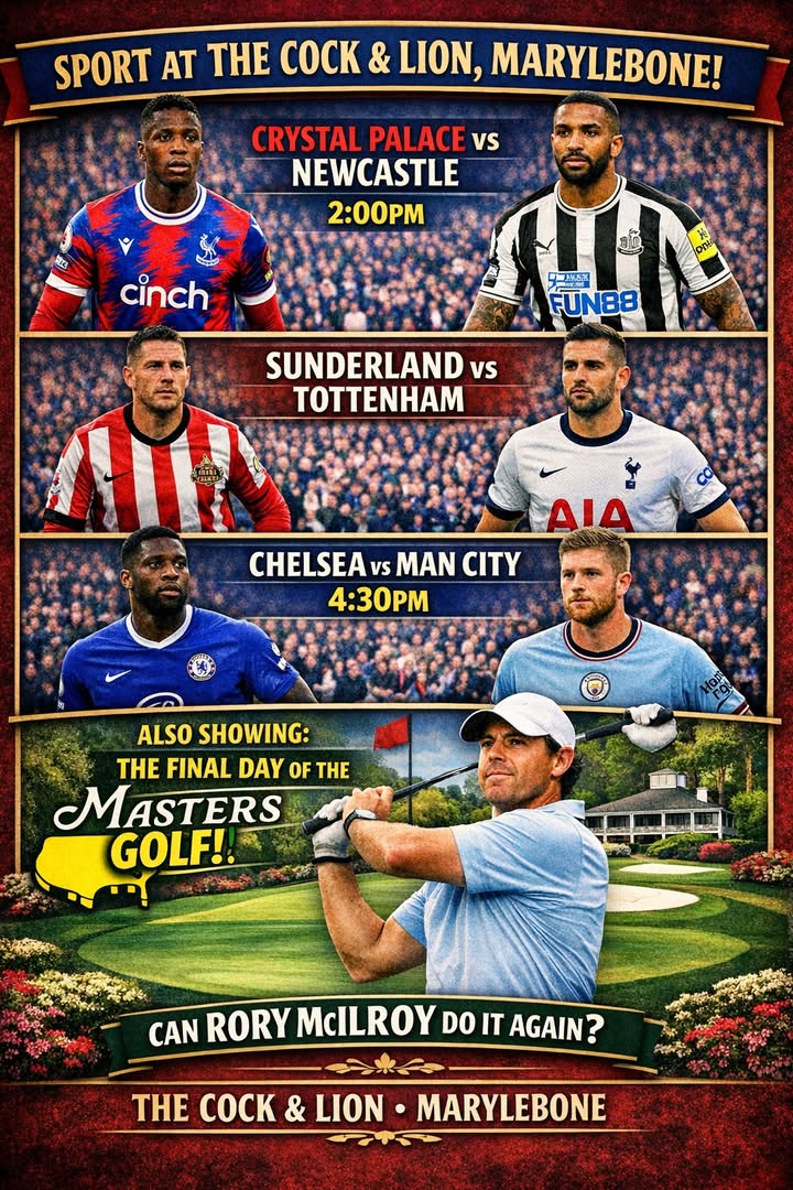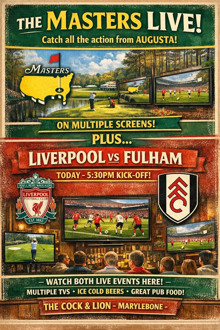 🏌️⚽ LIVE SPORT TODAY AT THE COCK & LION, MARYLEBONE ⚽🏌️ Join us for a cracking afternoon of live sport as we show The Masters LIVE from Augusta alongside Liverpool vs Fulham, kicking off at 5:30pm. With multiple TVs throughout the pub, you won’t miss a single shot or goal. We’ve got you covered with great views, ice‑cold beers and proper pub food. 📺 Masters Golf — LIVE ⚽ Liverpool vs Fulham — 5:30pm KO ✅ Multiple TVs 🍺 Big atmosphere guaranteed Get down early, grab a pint, and settle in for a brilliant day of sport.