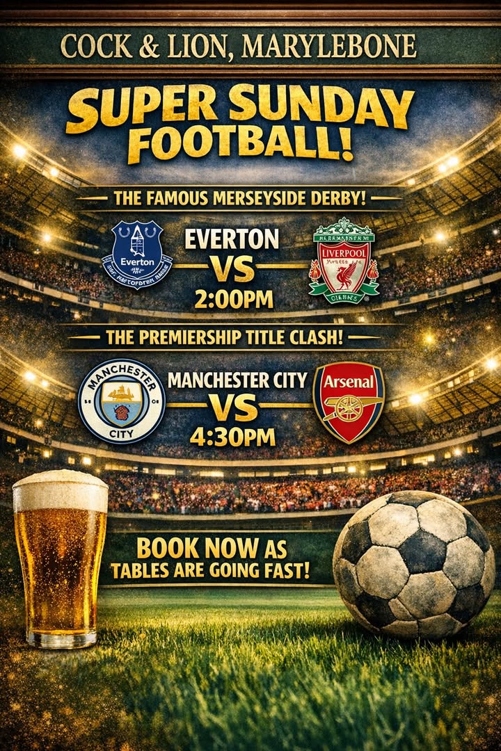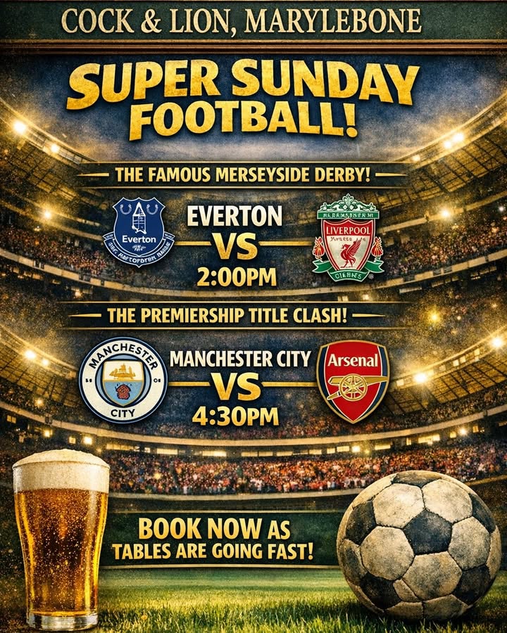 Super Sunday at The Cock and Lion sees the Premier League season hit crunch time as the title race and the battle for European places reach boiling point. Every point now matters in the run‑in, and tomorrow’s fixtures could shape the destination of the trophy and the make‑up of next season’s European competitions. First up is the Famous Merseyside Derby at 2:00pm, where Everton and Liverpool go head‑to‑head in one of English football’s fiercest rivalries. With pride on the line and vital points at stake, this is always a derby that delivers drama. Then at 4:30pm comes the blockbuster Title Clash – Manchester City vs Arsenal. Two of the Premier League’s heavyweights meet in a game that could define the championship race. With momentum, pressure and history all in play, this is unmissable Super Sunday football. Book now — tables are going fast.