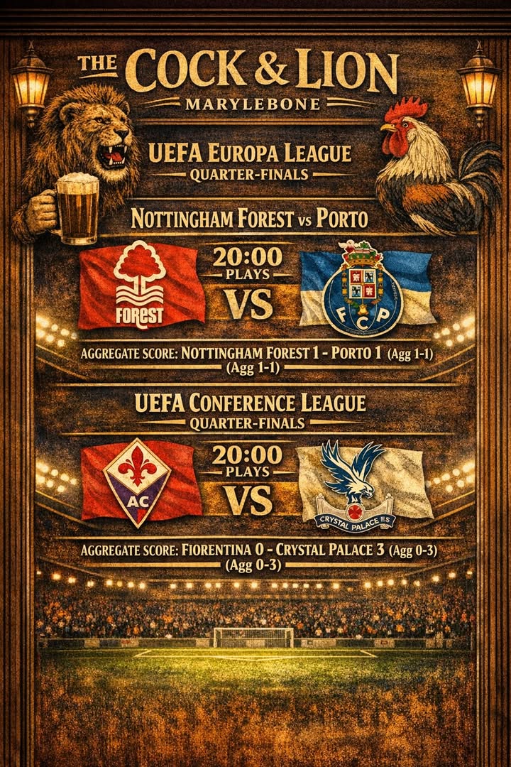 European football at the Cock & Lion tonight ⚽🍻 Kick-off from 8PM as we show all the action from the Europa Cup and Europa Conference League — with Nottingham Forest in Europa action and Crystal Palace in the Conference League. Big screens, cold pints, and proper match-night atmosphere in the heart of Marylebone. Get down early, grab your spot, and don’t miss a minute. 📍 Cock & Lion, Marylebone