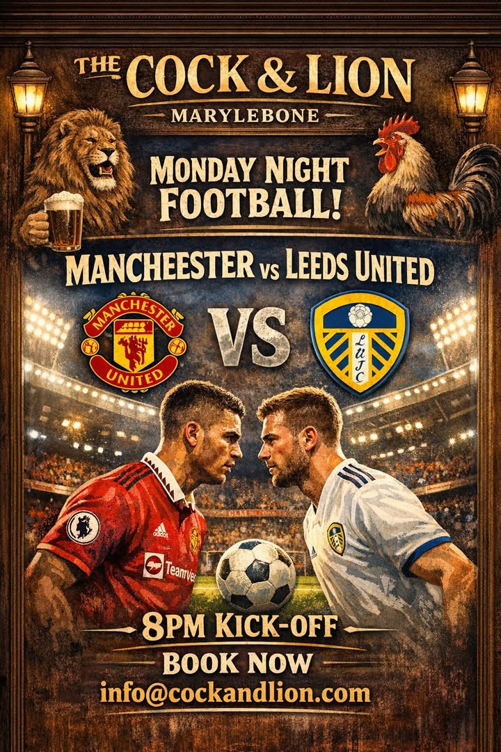 Monday Night Football is back Join us at The Cock & Lion for one of English football’s fiercest rivalries as Manchester United take on Leeds United under the lights. Big match, big atmosphere, and all the action live on our screens. Grab a pint, settle in, and enjoy Monday night done properly. Kick‑off at 8pm – get in early for the best seats. 🍻