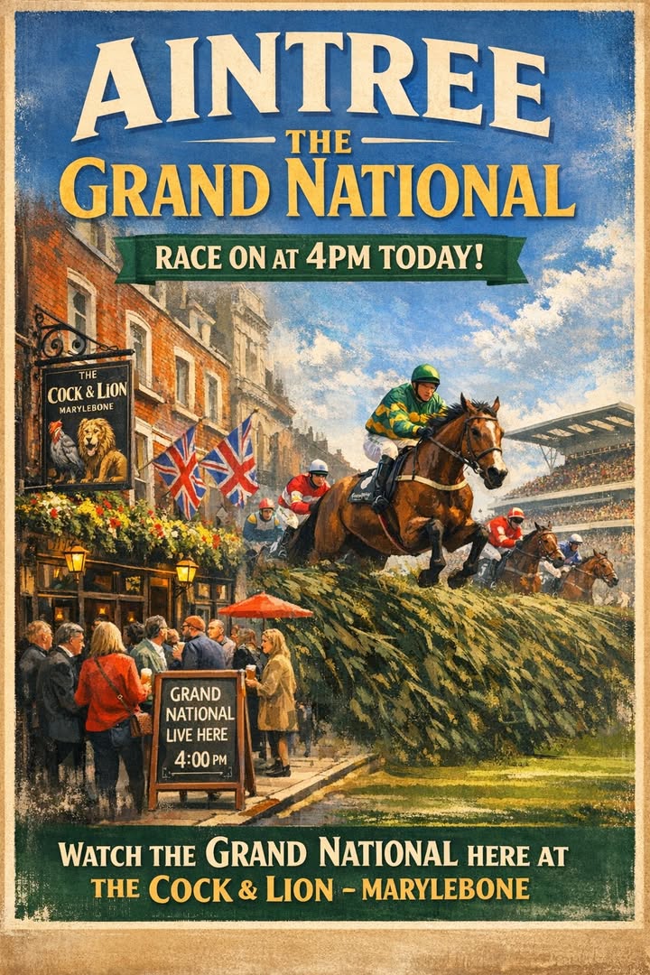 The countdown is on! The Grand National goes off at 4pm TODAY, and we’re showing every heart‑stopping moment live at The Cock & Lion, Marylebone. Expect a buzzing pub, flowing drinks, and a proper shout as they clear the last. See you at the bar before the tape goes up!